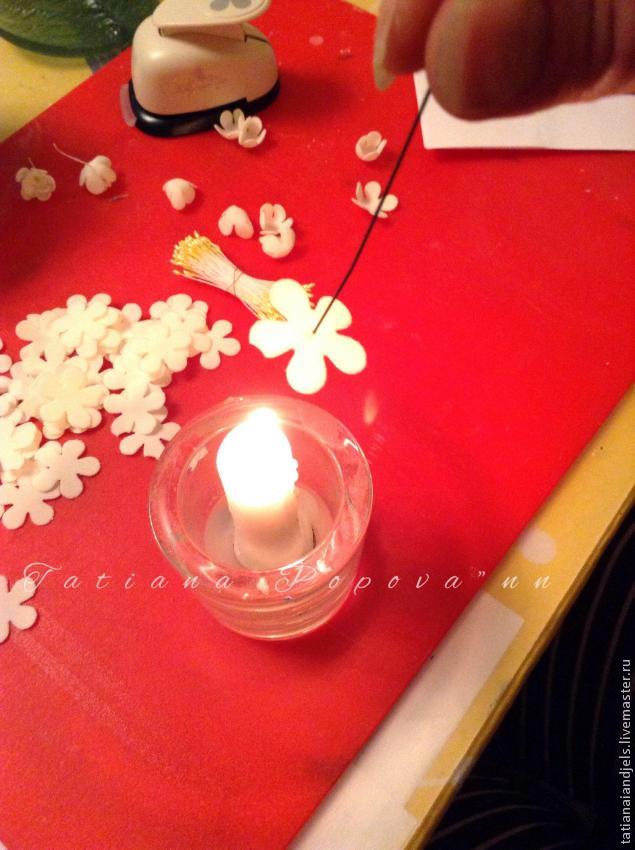 14. Шилом прокалываем картонный круг для установки цветов и листьев, расширяем дырочки ножницами.