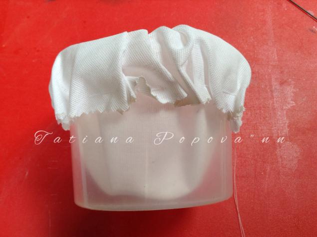 Для того, чтобы замаскировать края корзинки украшаем ее тканью с кружевом (можно использовать старую наволочку)