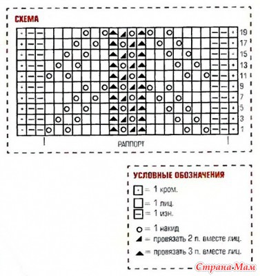 Ажурный узор: вязать по схеме, на которой приведены только лиц. р.: в изн. р. петли вязать по рисунку, накиды – изн. Начинать с петли перед раппортом, повторять петли раппорта, заканчивать петлями после раппорта. Повторять с 1-го по 20-й р.