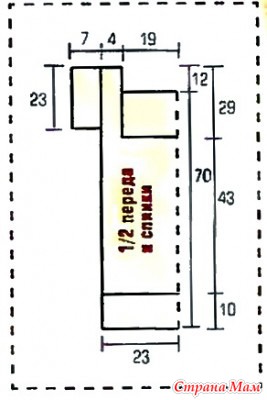 ПЕРЕД: вязать, как спинку, но с более глубоким вырезом горловины. Для этого через 53 см от наборного края закрыть средние 52 п. и обе стороны закончить раздельно.