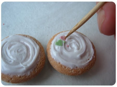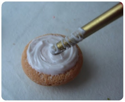 Так же готовлю «глазурь», смешав гель Фимо и кусочек белой пластики. Многочисленные описания приготовления такой смеси можно найти в сети, забив в поисковик «крем для кулинарной миниатюры», поэтому не буду утомлять читателей описанием этой процедуры. Тем временем извлекаю печеньки из духовки и опускаю в теплую воду. Сахар и лишняя пастель вымываются и мы получаем милые бисквитики, со структурой и цветом весьма напоминающие настоящие. На  одну из сторон наносим нашу глазурь,