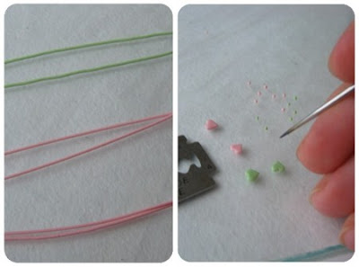 В хорошо прогретую духовку (я работаю с  глиной Фимо, поэтому придерживаюсь температуры в 110`С, пластика других производителей может запекаться при иной температуре, которая, как правило, указывается на упаковке) я отправляю свои печеньки на 20 мин., а тем временем готовлю для них украшение. Из пластики нежно-розового и бледно-зеленого цвета я делаю  крохотные шарики, а при помощи лезвия и иглы формирую маааленькие сердечки.