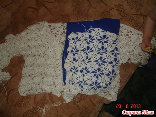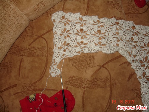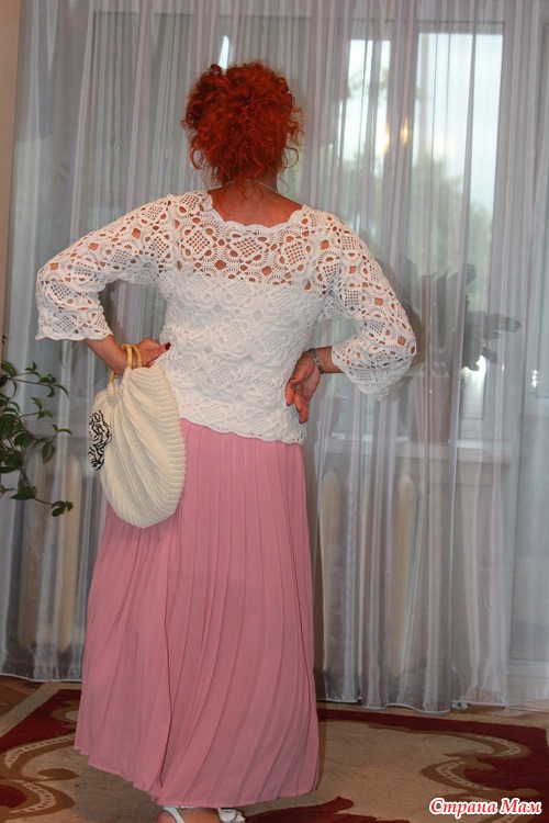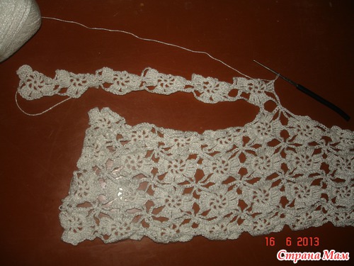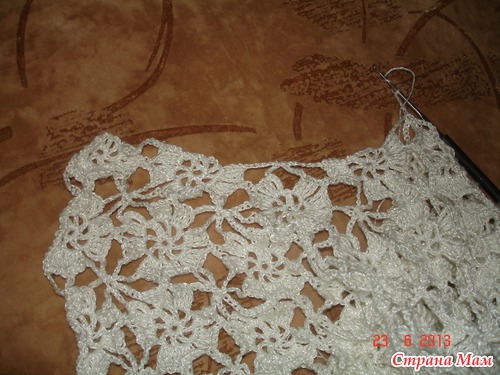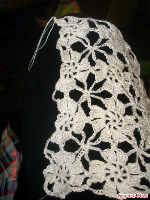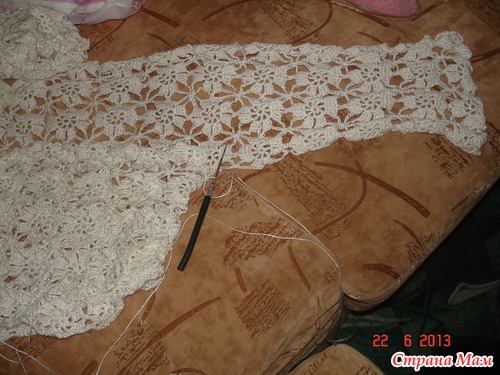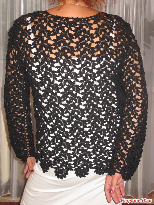 Нитки у меня обычные - детский летний хлопок . Когда оба полотна были готовы, сшила их по бокам, оставив место для проймы. Затем обвязала низ - 2 ряда С1Н и ракушки. Верх обвязала также. Затем макушки ракушек соединила на плечах и обвязала проймы. Что получилось - видно на фото. Ношу со спущенным плечом
