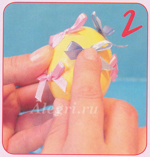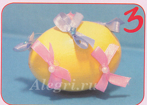 Из атласных или упаковочных ленточек можно сделать бантики и прикрепить степлером в районе соединения ручки. Тем самым мы не только прикрепим отделочный бантик, но и более надежно закрепим ручку, чтобы она не оторвалась под тяжестью яичка.