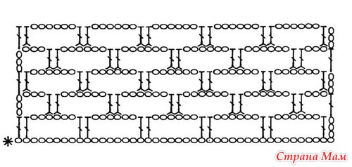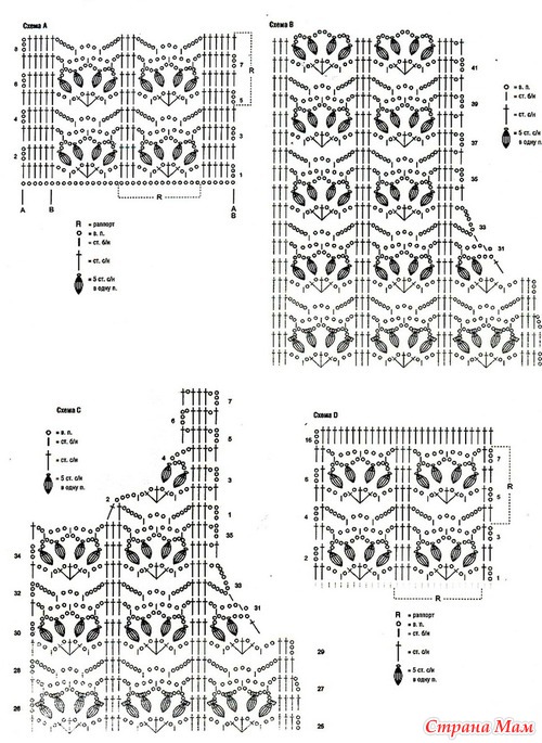 Спинка: выполнить цепочку из 93 е. п. и вяз. фантазийным узором по схеме А, начиная и заканчивая в местах, отмеченных буквой А = б больших групп п. и 6 ст. с/н с каждой стор.