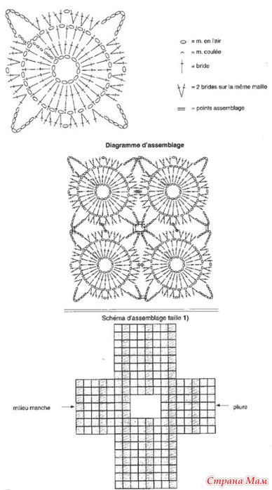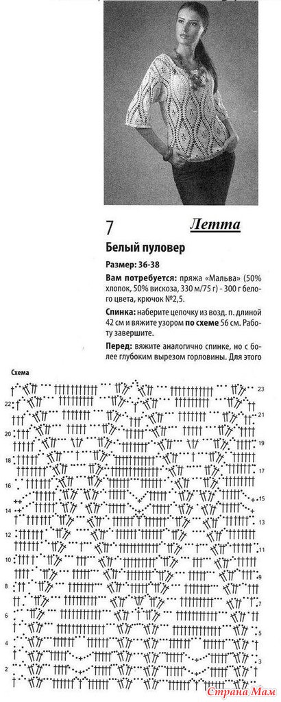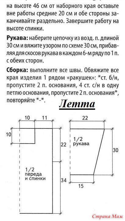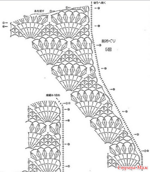 На высоте 25 см от нач. работы = 30-й р. прод. вяз. фантазийным узором по схеме 8 (на схеме показана только половина спинки (= пройма пр. края), вторую половину вяз. симметрично первой).