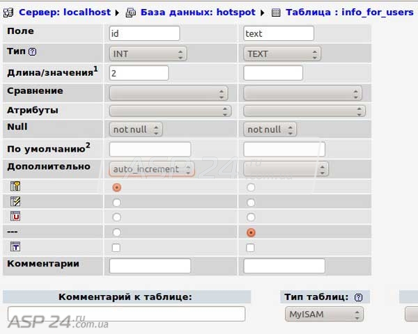 Создадим таблицу в базе данных, чтобы хранить там тексты сообщений. Назовём ее info_for_users. Таблица будет выглядеть таким образом: