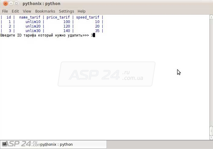 id_tarif = raw_input("Введите ID тарифа который нужно удалить>>> ")