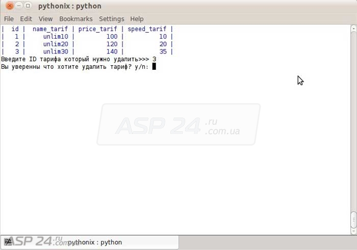 Для начала выполним функцию, которая выводит список тарифов, а также функцию raw_input, принимающую значения, введенные администратором, и помещающую их в переменную id_tarif: