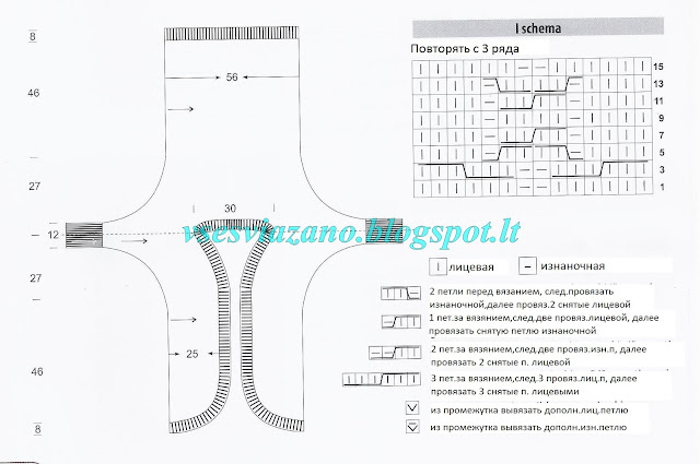 Далее вяжите косы по схеме I, а в промежутках между ними -14 изнаночных петель. Провязав 63 см от начала рукава, половину рукава со стороны спинки и спинку вяжите прямо до следующего рукава, а вторую половину рукава со стороны полочки готовьте к вывязыванию горловины.