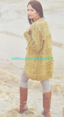Для второй полочки наберите 70 петель (14 петель- коса, 14-изнаночные петли, 14-коса, 14-изнаночные петли, 14-коса) и 2 ряда вяжите прямо, а потом в каждом 2 ряду прибавьте столько петель, сколько Вы закрывали при вязании предыдущей полочки. Когда Вы прибавите 16 петель для плеча, то дальше вяжите спинку и перед вместе и закончите второй рукав манжетой точно так же, как Вы начинали вязать первый из рукавов.
