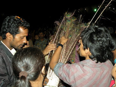 Самый ходовой товар дня, прямо нарасхват - павлиньи перья. В другой день их никто и даром брать не станет. А всё потому, что Кришна у верующих ассоциируется с павлином. Эта птица олицетворяет собой бессмертие, и Кришна всегда украшает себя павлиньим пером, чтобы напоминать всем окружающим, что он и есть источник бессмертия. Кроме того, на павлиньем пере есть "глаз", который олицетворяет собой всевидящее око и Кришна, нося павлинье перо, говорит о том, что видит всё, поэтому разумный человек должен действовать так, чтобы ему потом не было стыдно за свои поступки.