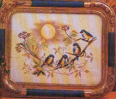 Вышивка. Птицы на ветке - птицы поют, солнце встает. |