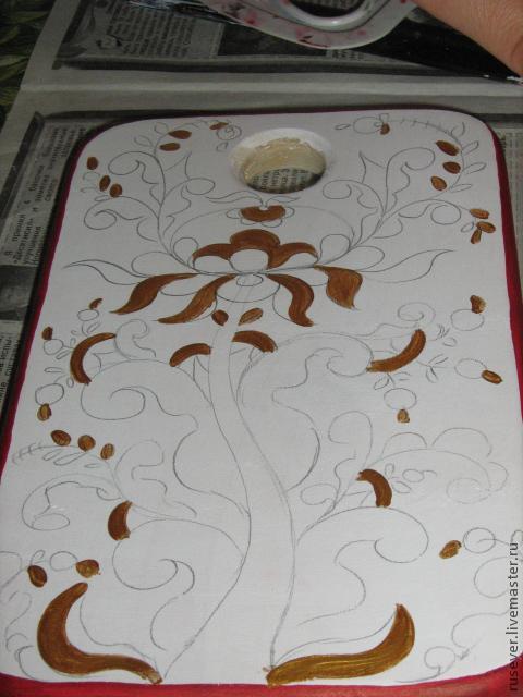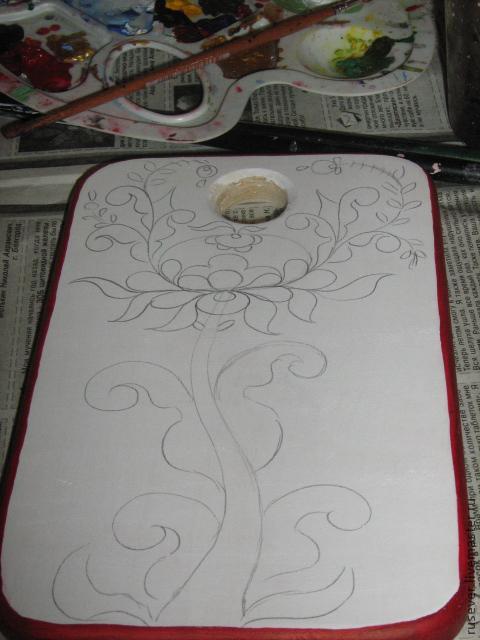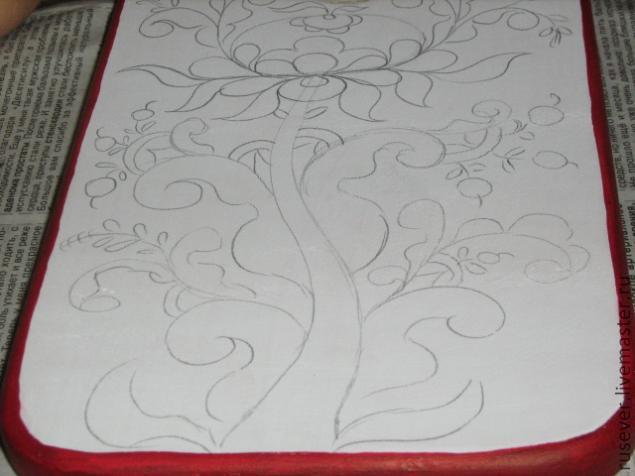 Древо Жизни - это понятие существует едва ли не в каждой культуре, начиная от культуры североамериканских индейцев, заканчивая верованиями народов Севера. Оно неразделимо связано с культом Солнца, является символом плодородия, жизни как таковой. Этот образ по-разному выражен в каждой из культур, где-то схожий с фаллическим символом, как, например, в мезенской росписи, где-то расцветший пышным цветом, как воплощение жизненной силы. В русской росписи, как мне кажется, один из красивейших символов - это борецкое Древо Жизни. Борецкая роспись пышна и нарядна сама по себе, а само древо предстает здесь в виде алого цветка на толстом стебле с многочисленными отростками, листьями, ягодами разных цветов. Несмотря на кажущуюся сложность рисовать его достаточно просто, если у вас уже есть кое-какие навыки росписи. Давайте вместе с вами попробуем написать древо жизни на небольшой доске, которая потом к тому же сможет украсить вашу кухню.