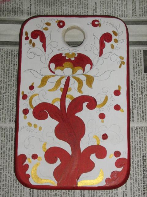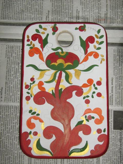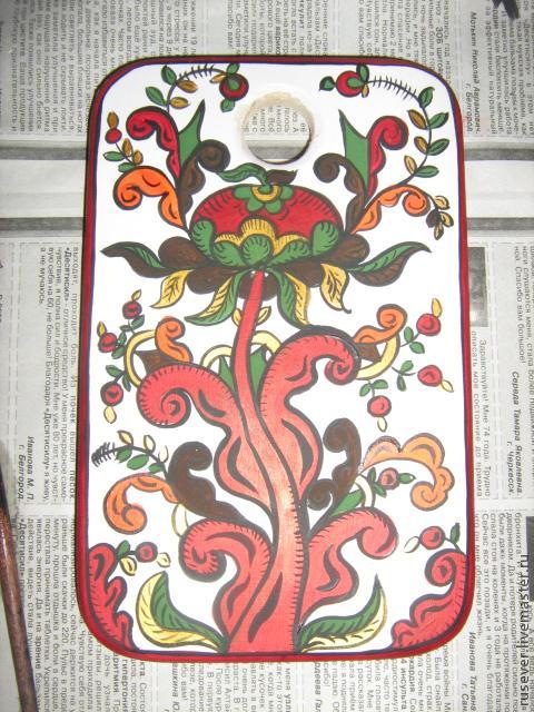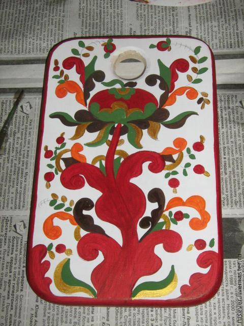 Теперь останется только покрыть досточку лаком. Помните, что акриловый лак хорош тем, что быстро сохнет и не пахнет, оданко он может "потянуть" за собой гуашь и вдобавок сохраняет некоторую клейкость после высыхания. Если же вы хотите пользоваться доской на кухне, лучше остановиться на масляном лаке, тогда ваш рисунок будет держаться долго и, возможно, вдохновит вас на создание других замечательных вещей. Ведь народные сюжеты способны вписаться практически в любую поверхность, будь то доска или яйцо, сахарница или детская мебель. Желаю вам удачи и радостного творчества!