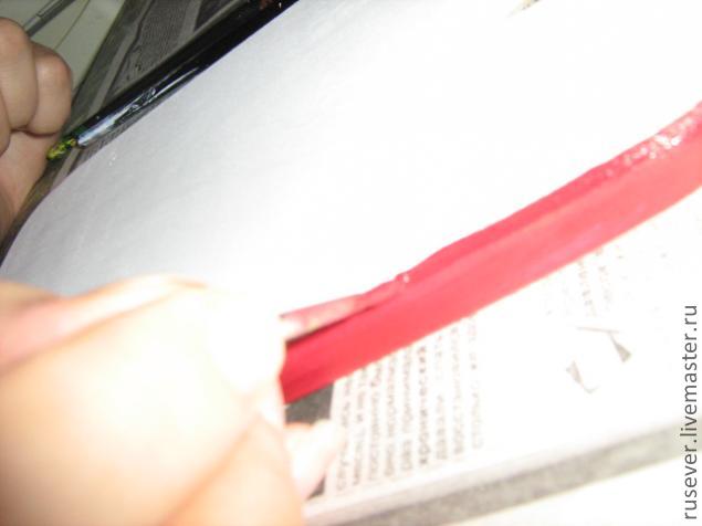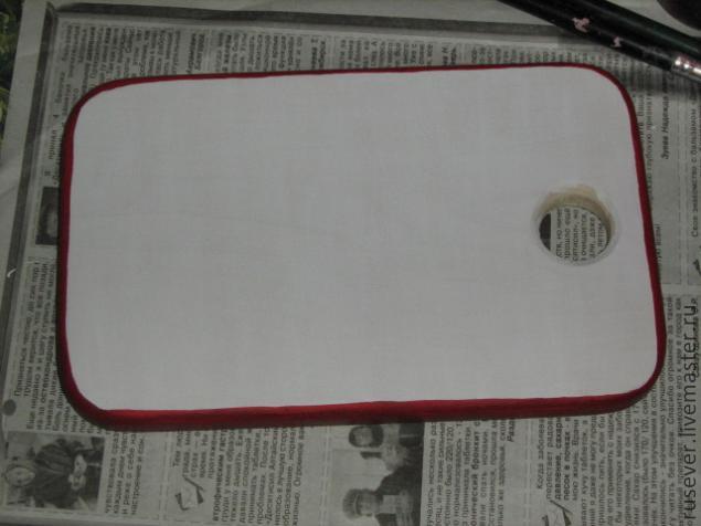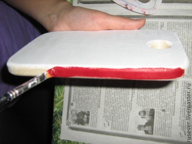 При грунтовке пользуемся плоской кистью, грунтуем поверхность на два раза, причем второй раз наносим краску перпендикулярно первому слою. Затем красим красной краской боковую поверхность доски, сначала плоской кистью, затем круглой подравниваем