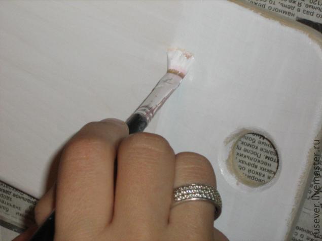 Затем начинаем грунтовать доску. Иногда для этого используется специальный грунт, мы же воспользуемся простым белым акрилом, поскольку борецкая роспись - белофонная.