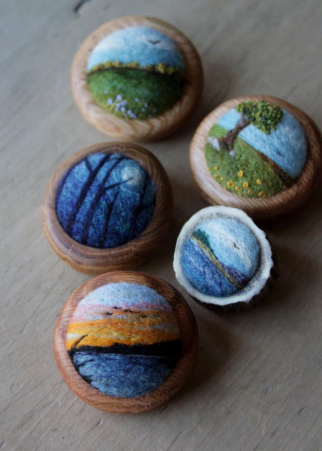 Удивительные брошки, над которыми с удовольствием трудится Лиза Джордан, мало кого могут оставить равнодушными. Основа украшения - натуральное дерево, а декоративный элемент - миниатюрный пейзаж, свалянный из разноцветного войлока. Причем так искусно и мастерски, что впору удивиться, неужели это сделано методом валяния, а не раскрашено красками уже по готовому изделию. Художница создает из войлока миниатюрные пасторали, вдохновляясь теми пейзажами, которые ее окружают. Закат над лесом или сумерки, дерево на опушке, покрытая цветами полянка, набегающая на берег моря волна, уходящее за горизонт поле с оранжевыми колосьями, - те немногие варианты войлочных картин, которые можно увидеть на украшениях, сделанных Лизой Джордан.