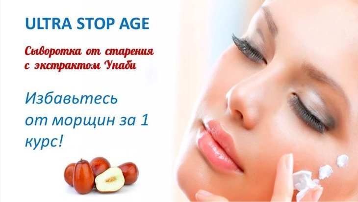 Возраст больше не властвует над вами, если у вас есть сыворотка Ultra Stop Age от морщин. Всего один курс применения требуется для того, чтобы вернуть молодость и здоровье кожи. Благодаря наличию в составе экстракта Унаби теперь глубокий омолаживающий эффект доступен без операций и уколов в домашних условиях. Средство полностью натуральное, поэтому не вызывает негативного влияния.