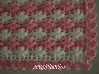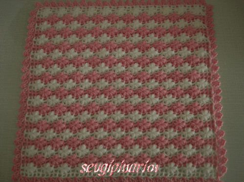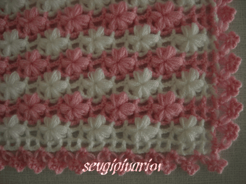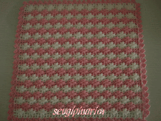 Свяжите 1-й вспомогательный ряд из СБН и еще 2 ряда узора серой пряжей. Затем каждые следующие 2 ряда меняйте цвет пряжи, чередуя серый цвет, темно-розовый и светло-розовый цвет. Закончить плед желательно также серым цветом. Готовый плед обвяжите по периметру одним рядом СБН.
