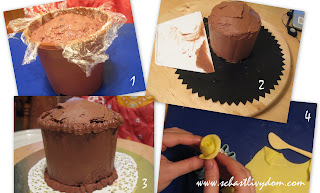 Обмазываем наш торт горшок, я выравнивала с помощью специального скребка, но можно с помощью ножа или просто полоски бумаги(Рис.1,2).Убираем в холодильник, крем быстро застывает (Рис 1, 3) Затем можно украшать и упаковывать: