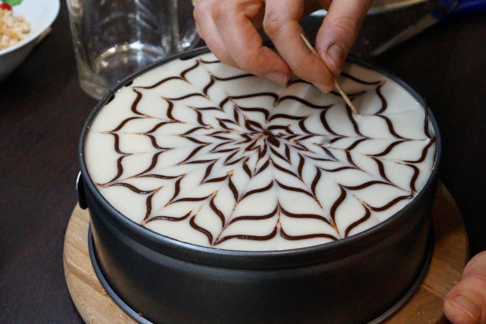 Коричневую помадку наливаем в кондитерский мешок с самой тонкой насадкой или в самодельный конвертик из пергаментной бумаги. Сразу же рисуем круги по спирали начиная от центра и продвигаясь к краю.