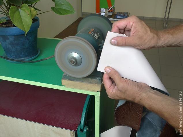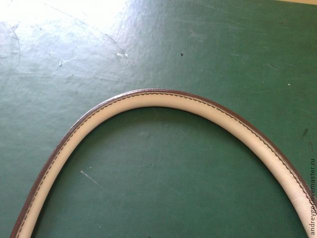 I. Окрашиваем урез, после делаем закрепки и прячем концы ниток между слоями кожи, еще пару раз наносим краску.
