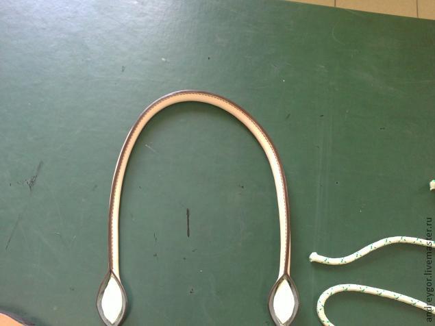 I. Соберем узел крепления кисти к донышку сумки, он же усиливает само дно. Изготовим любым способом небольшой шнур (черенок кисти). Один конец вклеиваем между двумя деталями из плотного материала (картон), а другой остается свободным.