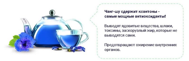 Целебные свойства напитка обусловлены натуральным составов. В него не входят химические примеси и стабилизаторы, только цветки клитории тройчатой. Состав чая Чанг-Шу насыщен биологическими активными веществами: