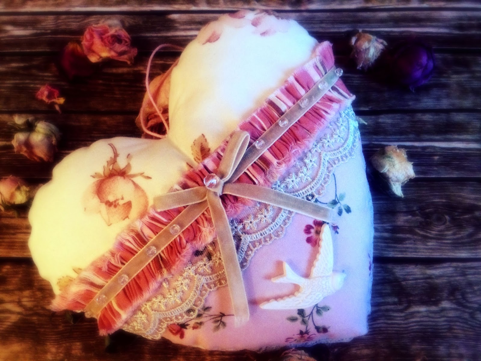 Приветствую Всех!! Участвую в совместном проекте "Фабрика нежности", где надо сотворить вещи в стиле шебби-шик. Тяжело мне далось это мягкое сердце,муки творчества проявились на лицо. Начиная с 31 января (тогда стартовал этот проект) я крутила мысли в голове и так и этак. Вдохновлялась множеством сердечек из интернета. Но ничего не приходило. Брала в руки ткани и кружева, совмещала, прикладывала, а все не то, не то.... Сроки поджимали, ведь до 14 февраля надо уже как отчитаться! За вчерашний выходной поднапрягла мысли и выдала вот это сердечко:
