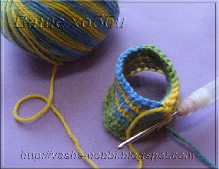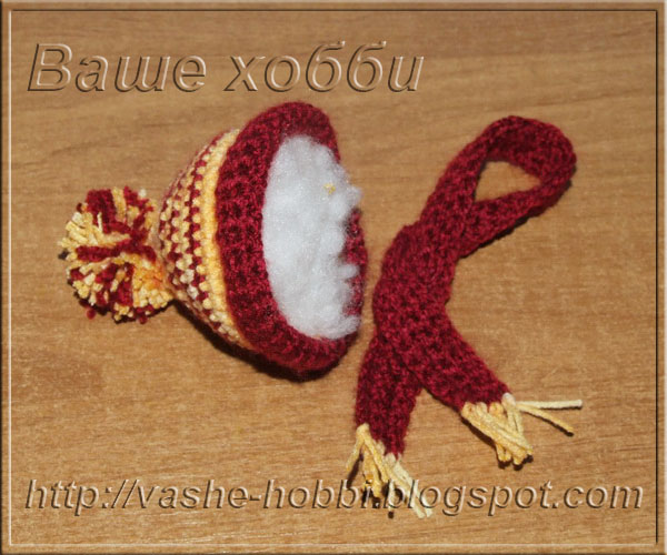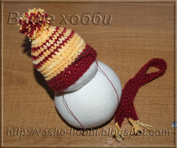Одежду для снеговика можно сделать из фетра, а если Вы вяжете, то можно связать из остатков ниток. Для шапочки наберем цепочку из воздушных петель длиной равной окружности головы снеговика, замкнем в кольцо и продолжаем вязать по кругу столбиками без накида.