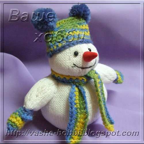 Свяжем рукавички и шарфик, надежно закрепим их на нашем снеговике. Ну, вот и все, новорожденный снеговик уже глядит на вас и улыбается!