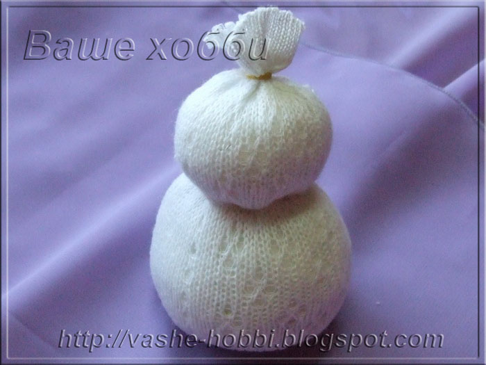 Руки пришиваем к телу снеговика. Вот и готов снеговик. Приступаем к декорированию. Вышиваем лицо, делаем из пластики или застывающего пластилина морковку-носик и крепим на клей.