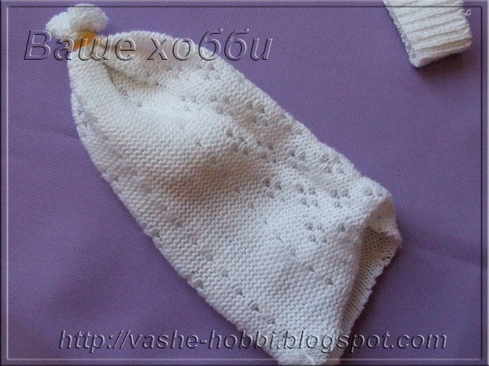 Можно сделать шапочку с двумя помпонами, тогда сокращения делать не нужно. Можно соединить полотно столбиками без накида, как показано на фото ниже.