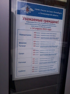 Рядом висит другое объявление – о том, сколько талонов автомат выдает в разные дни недели. В понедельник мало – 550 штук, больше всего в субботу – 1010 штук. Сколько талонов – столько человек в день могут подать документы на оформление загранпаспортов.