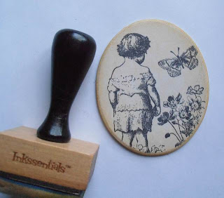 8. Наша рамка полностью готова, осталось выбрать подходящее изображение. Я воспользовалась штампом La Blanche с винтажным изображением ребёнка, оттиск которого сделала чернилами Archival Ink Jat Black на бумаге Prima Marketing Printery. Затем наложила на него овал от рамки, обвела простым карандашом.