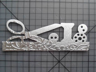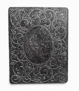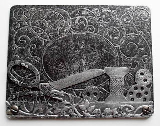5. Подготовим задний фон. Для его создания я использовала чипборд и папку для тиснения Cuttlebug с изображением рамки, с которой сняла совсем немного краски круговыми движениями, чтобы не только проявить "царапины", но и добавить новые. Края чипборда я предварительно закруглила с помощью инструмента (можно воспользоваться ножницами и наждачной бумагой, стараясь не повредить слой фольги). Резать такой чипборд удобно дисковым или макетным ножом, а также резаком с дисковым (роликовым) ножом.
