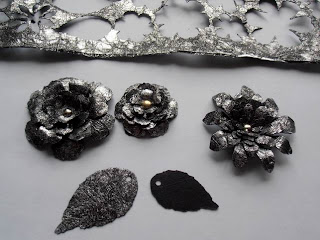 Готовые вырубки я собрала на брадсы и с помощью пальцев и пинцета изогнула лепестки, - они прекрасно держат форму и имеют достаточную жёсткость, чтобы выглядеть как металлические. Я выбрала чёрную тонировку, но также будет отлично смотреться любая другая.