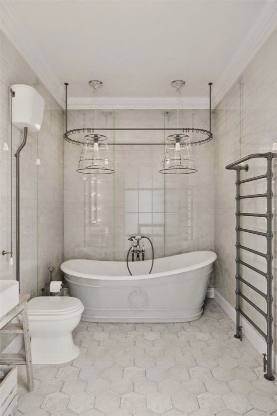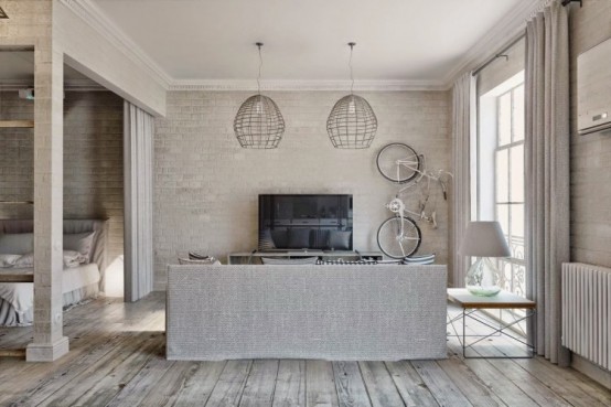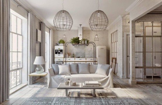 Эта красивая квартира в Праге дизайнера - интерьера Антона Медведева, имеет сильный Вау-фактор! К вашим услугам палитра из мягких серых, бежевых и белых тонов , и в то же время кирпичные стены и дубовый паркет добав ляют текстуру и контраст. Это прекрасное сочетание традиционного, индустриального и современного, с участием промышленных акцентов и тонны естественного света.Дом в спокойной атмосфере подсвечивается натуральными тканями в тон всему пространству. Я никогда не видел такое невероятное сочетание шебби-шик со штрихами современного дизайна– это так гармонично и так хорошо-о! Одно из самых великолепных помещений является, пожалуй, комната, где шикарные современные плитки и мрамор смешаны с винтажной ванной,радиаторами и шебби-шик лампой.