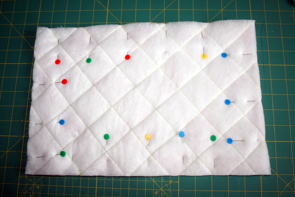 1 ШАГ: На синтепон накладываем ткань А, закрепляем и делаем диагональные строчки на расстоянии 5 см. друг от друга в одну сторону, затем в другую, чтобы у нас получились квадраты 5*5 см. Выглядывающий по краям синтепон после того, как сделали стежку отрезаем.
