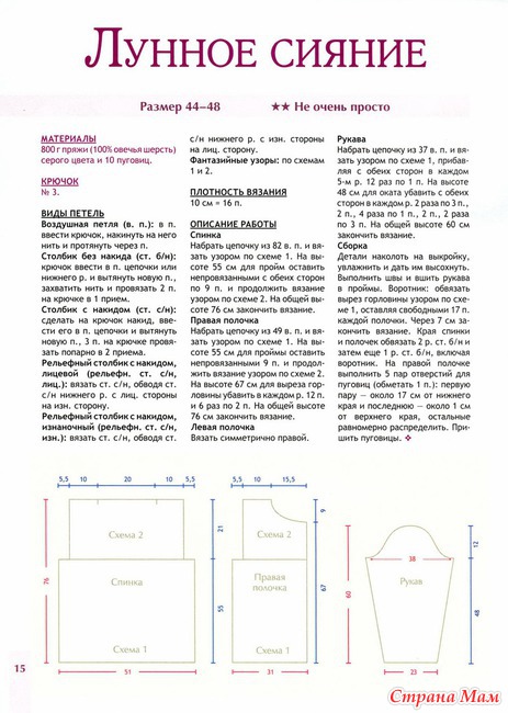 Вам потребуется для вязания жакета: 700 (750) г бежевой пряжи India Cotton (56% микроволокна, 44% хлопка, 50 м/50 г); крючок № 7; 2 декоративные пуговицы; 2 кнопки.