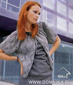 Состоит из 2-х частей - переда и спинки, которые вяжутся снизу вверх. На полочках - нагрудные вытачки. Оформительная полоса по горловине выполняется непосредственно на готовом изделии (привязывается), а по низу вяжется отдельно, после чего пришивается. Рукав выполнен от бокового шва, по необходимому объему руки.