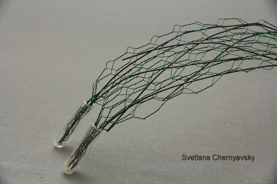 2. Разрезать боковые края дуги и сформировать ножки. Проволочную сетку, скомканную для ножек, помещаем в пробирки от цветов для того, чтобы придать законченный вид структуре. В пробирки налить горячий клей и вставить проволочные ножки.