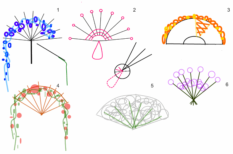 Можно изготовить веер из проволоки - сделать длинные спицы и согнуть их пополам, у основания связать. Пространство веера декорировать бульонкой, переплетая ее для создания полотна.
