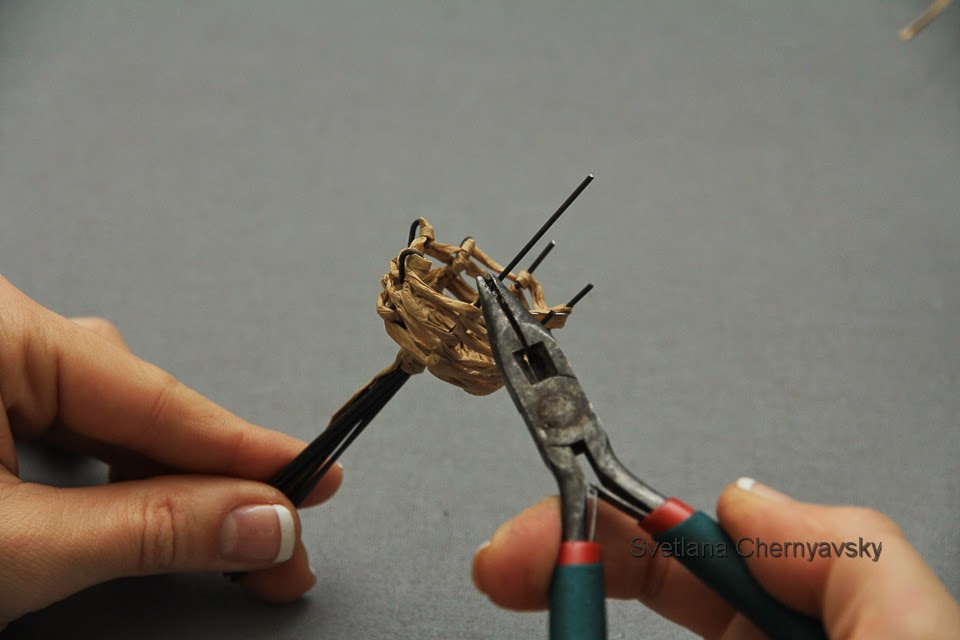Четное количество проволок (у меня 8), длиной 10 см, связываем вместе бумажной проволокой посередине. Далее отгибаем в строну 7 верхних проволок, одну оставляем смотрящую вверх, для насаживания свечи. Используем плетение паутинку для формирования донышка подсвечника, далее отгибаем все проволочки вверх и продолжаем плетение еще 2 см. Отогнуть концы проволоки вниз для завершения верха.