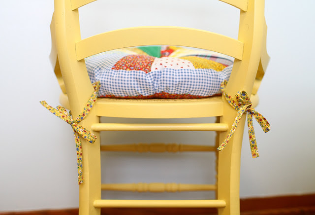 Сшить тесемки, для того ,чтобы подушку можно было фиксировать на стуле, завязав тесемки на стойках стула