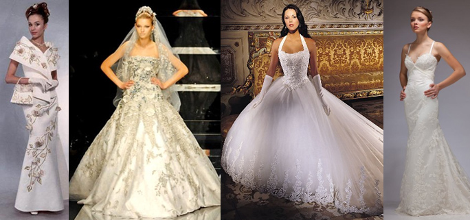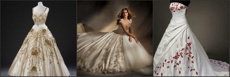 На свадебных нарядах часто встречается вышивка бисером, имитация вышивки жемчугом, вышивка кружевом, пайетками, стразами, лентами, реже — вышивка крестиком и (атласником) гладью, мережка, ришелье и рококо.