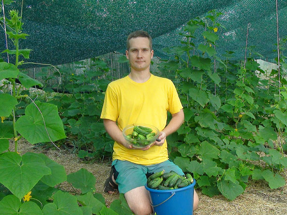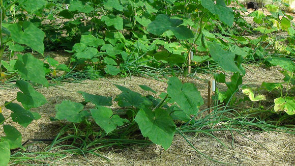 Огурцы планировалось выращивать в отсеке из полиэтиленовой пленки, натянутой поверх заборной сетки. В качеств мульчи решили применить солому, а для удобства полива – организовать капельный полив.