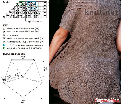 Пятиконечная шаль с отверстиями для рук. Вяжется по кругу от каймы к центру. Сменить спицы на более короткие, когда уменьшится число петель, а затем перейти на чулочные (двунаправленные) спицы.