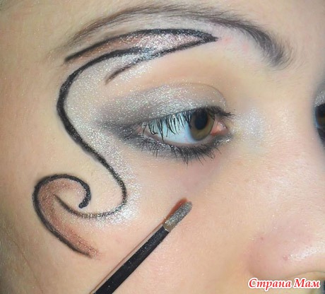 Наш рисунок выведен, необходимо теперь правильно наложить тени. Новогодний макияж в стиле черного дракона 2012 требует теплых оттенков, какие мы и используем, но вперемешку с белоснежными зимними оттенками.